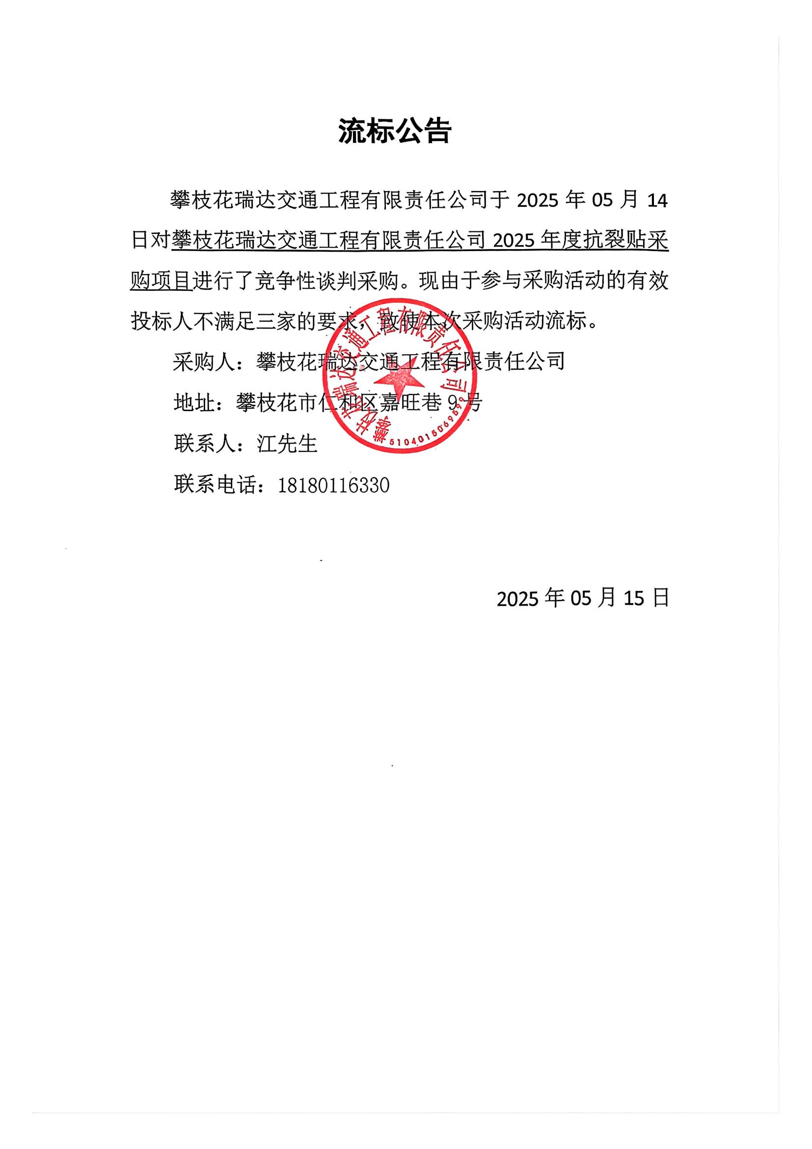 攀枝花瑞達(dá)交通工程有限責(zé)任公司2025年度抗裂貼采購(gòu)項(xiàng)目競(jìng)爭(zhēng)性談判流標(biāo)公告