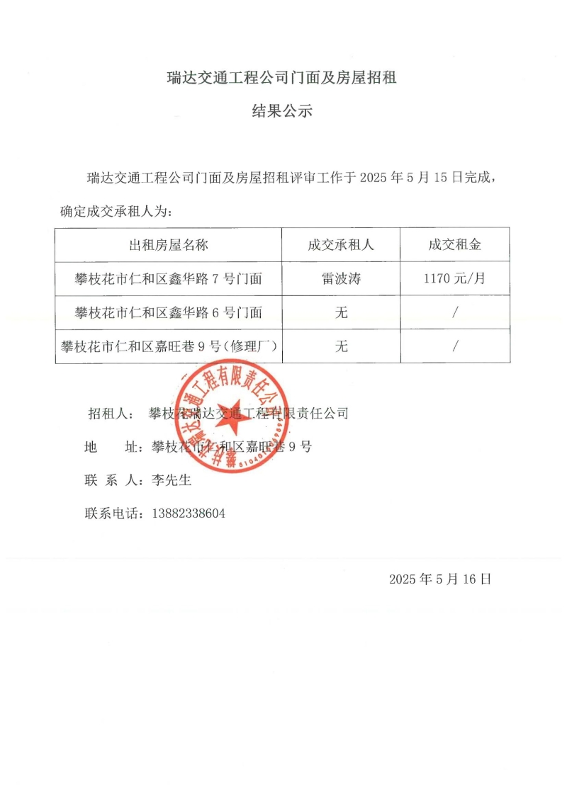 瑞達(dá)交通工程公司門面及房屋招租結(jié)果公示