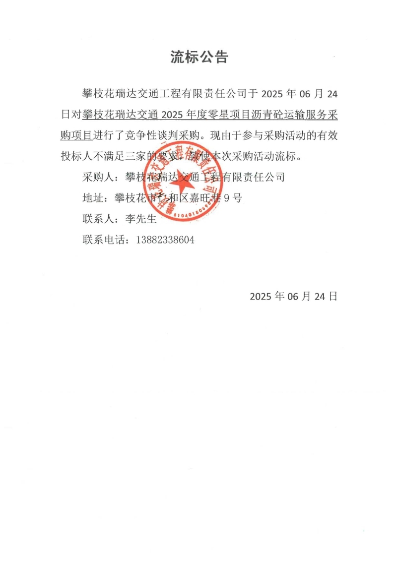 攀枝花瑞達(dá)交通2025年度零星項(xiàng)目瀝青砼運(yùn)輸服務(wù)采購(gòu)項(xiàng)目競(jìng)爭(zhēng)性談判流標(biāo)公告